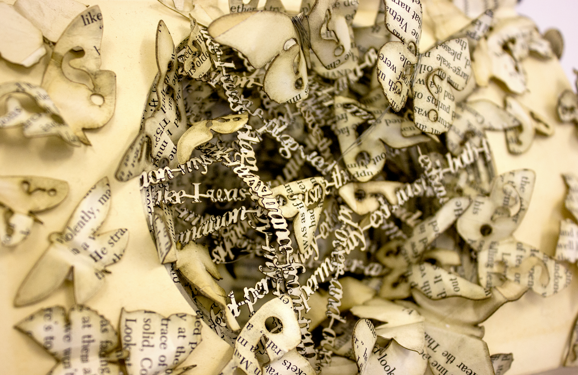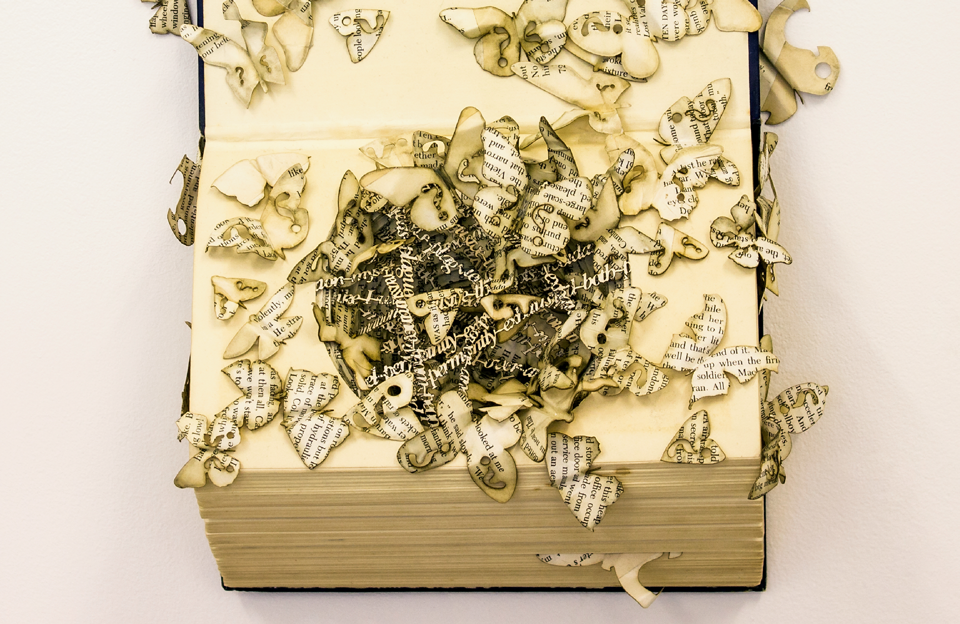 This is the second of my book sculptures for my final-year project. It uses a visual metaphor to convey the emotions of obsessive-compulsive disorder, and embodies my research by visualising an expression used by a sufferer of OCD. The expression was ‘plagued by doubt’, because the person repetitively sought reassurance and kept checking things.