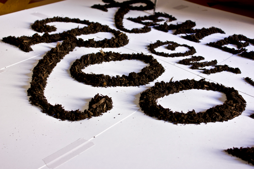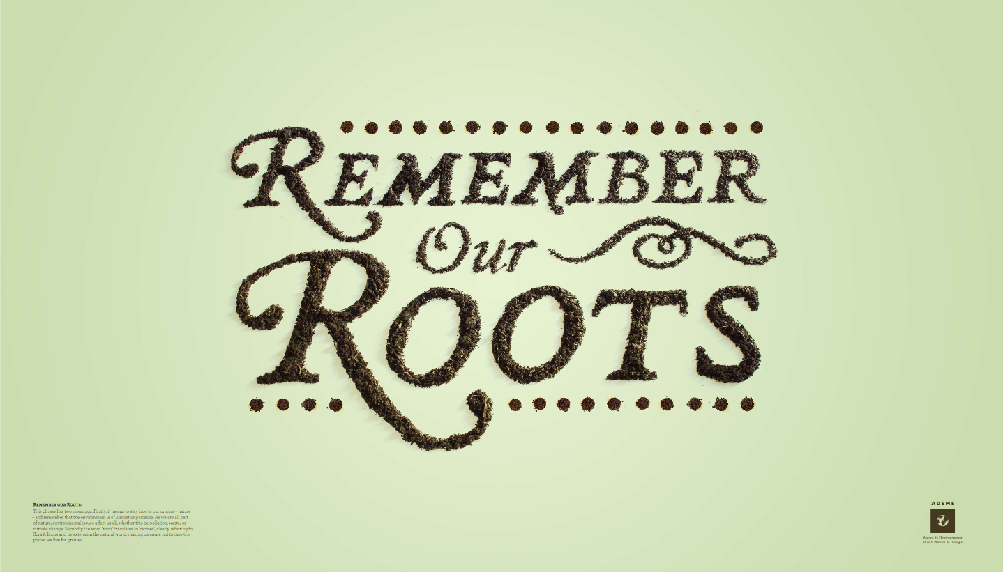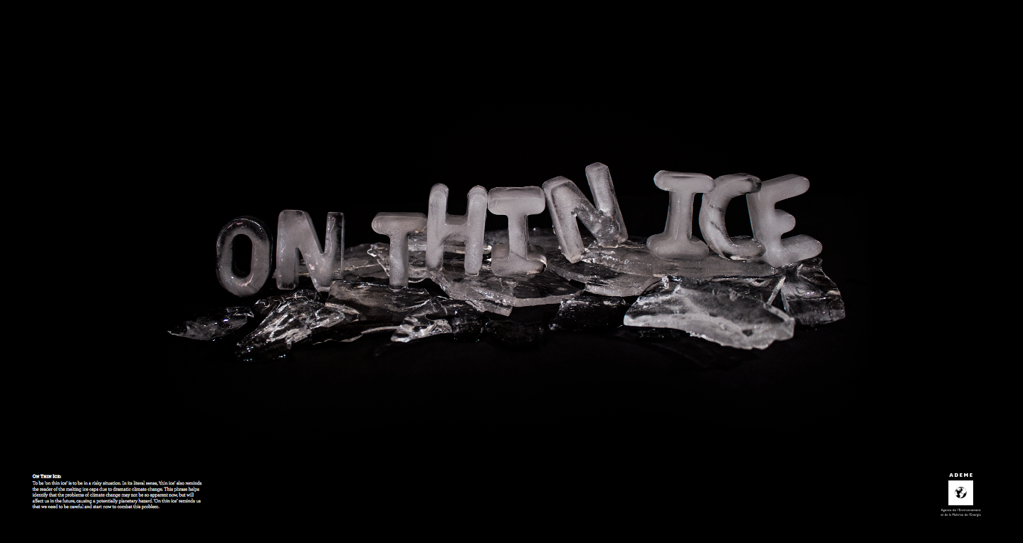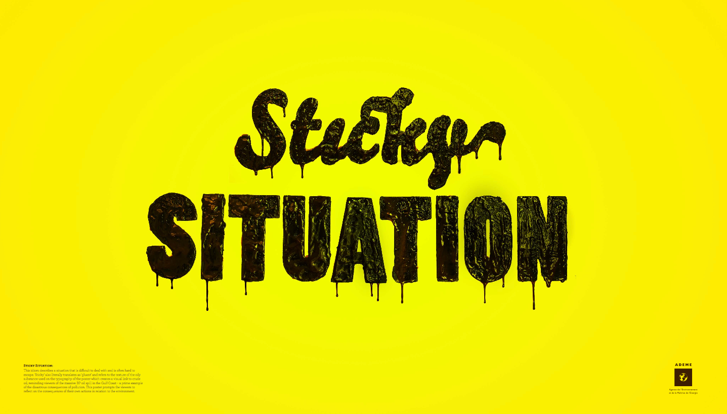 This project was a response to a live brief to promote environmental awareness among teens. The posters use idiomatic phrases which can be seen to focus on different environmental issues. 'Sticky Situation', referring to the BP oil spill, is accompanied by text on pollution; 'Take a Deep Breath' focuses on clean air; 'Remember our Roots' reminds the viewer of global warming; 'Dirty Talk' alludes to waste; and 'On Thin Ice' is a reminder of the melting polar ice caps. The type itself is made from unusual materials (bottles, ice, tin foil, soil …) which reflect the phrases.