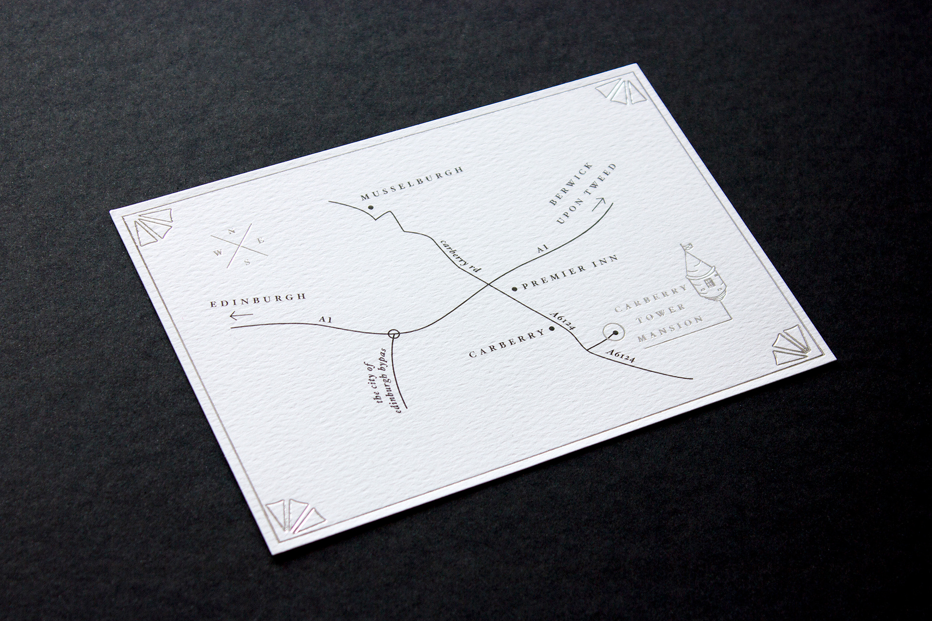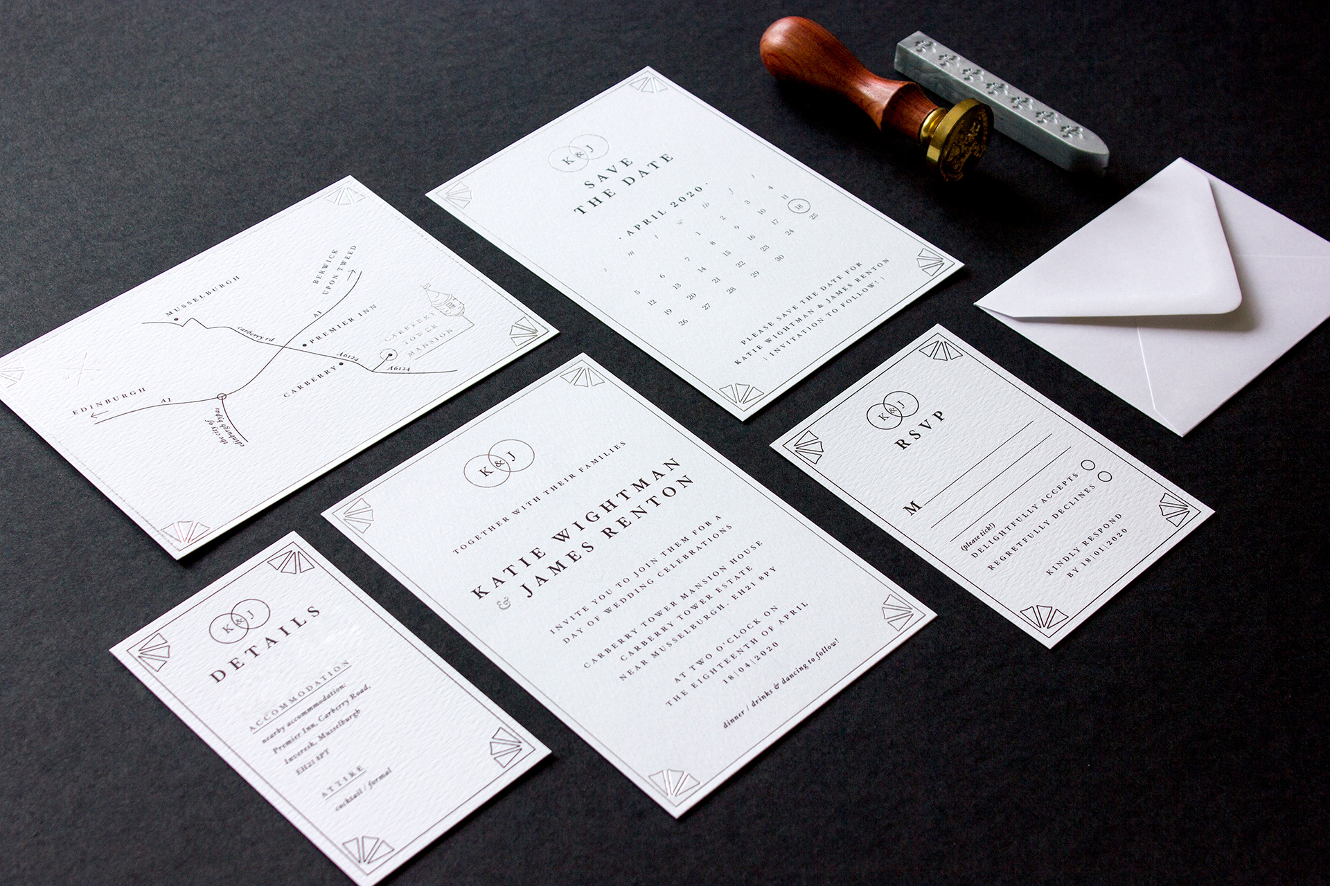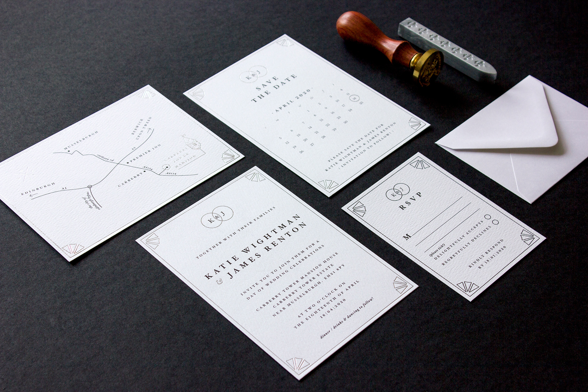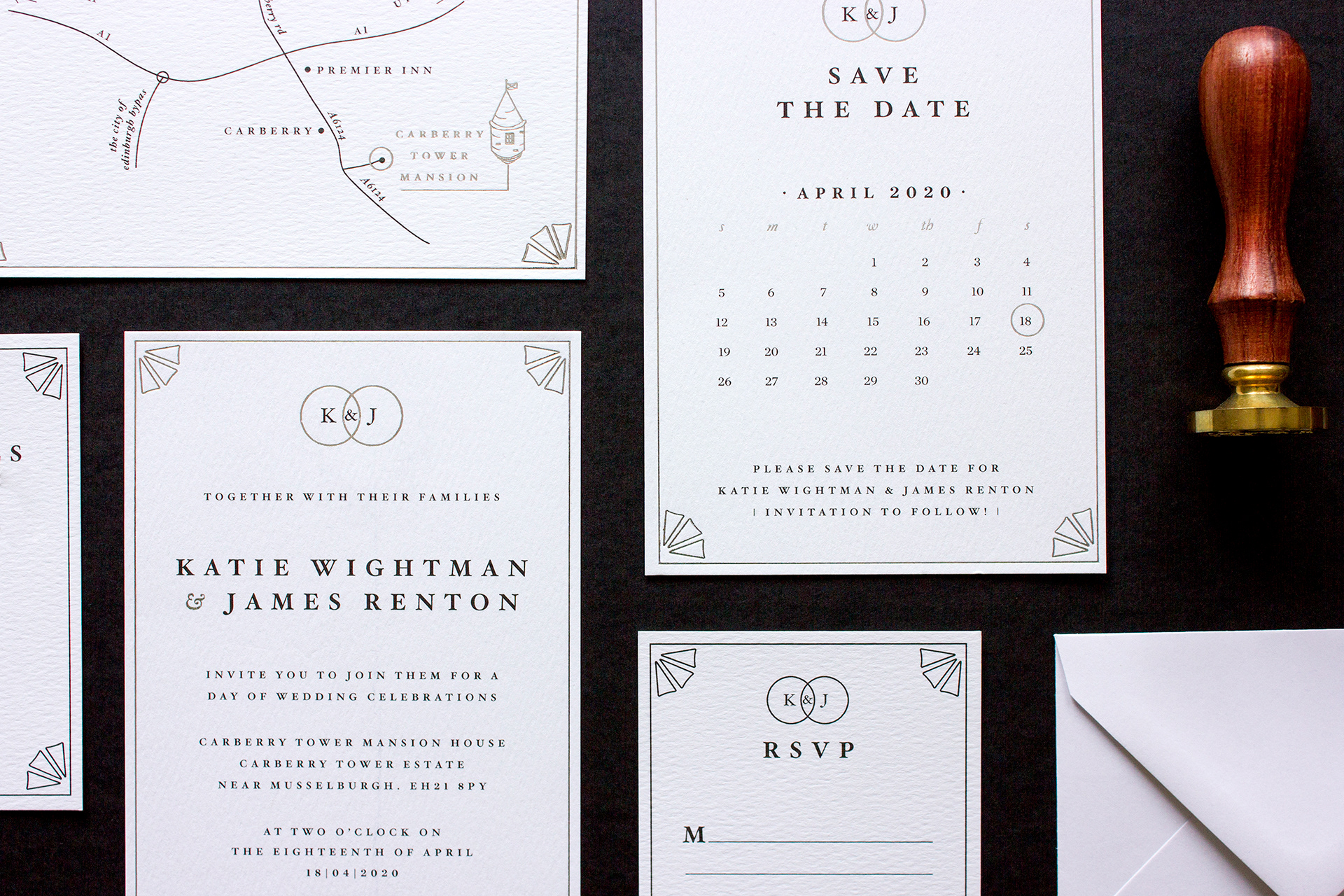 Bespoke wedding stationary created for Scottish couple Katie & Jamie. The logo lock-up was made up from their initials 'K&J' which are interlinked by two silver foiled wedding bands. Silver foil elements were used throughout all stationary highlighting details. The pack included a Ceremony invitation, Save The Date, Map, RSVP & details card. Each of which has a silver foiled border with designs from their wedding venue.