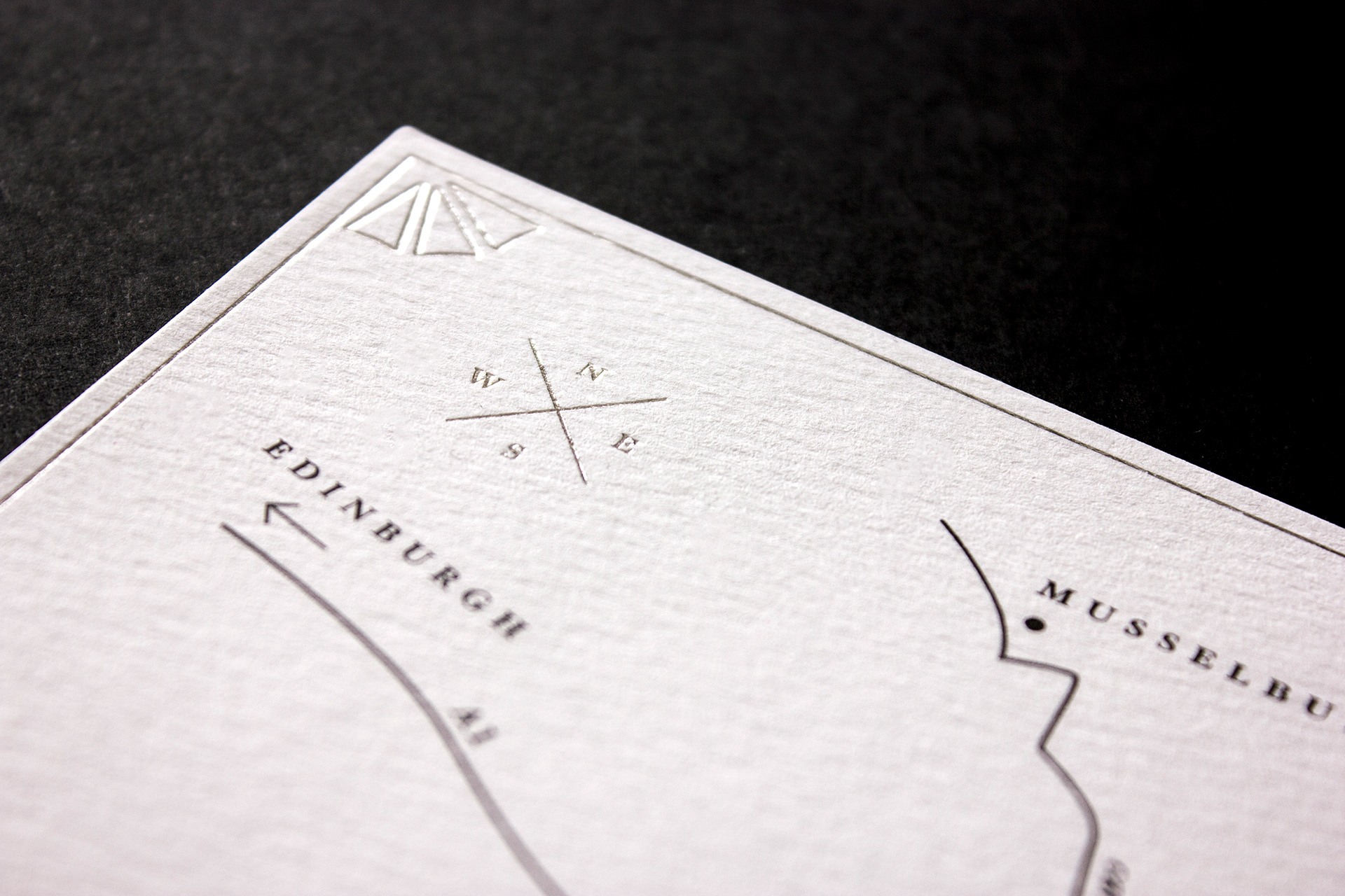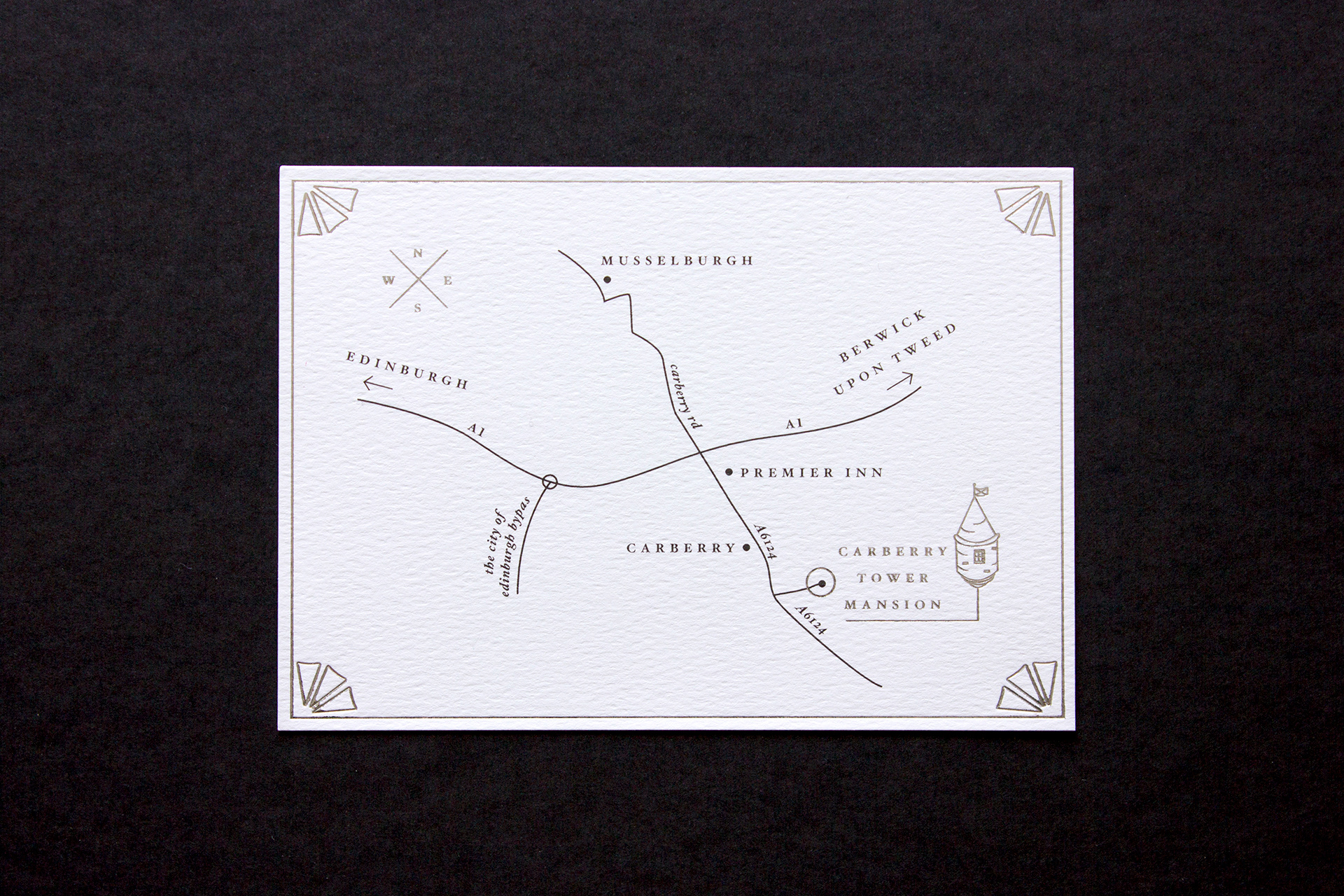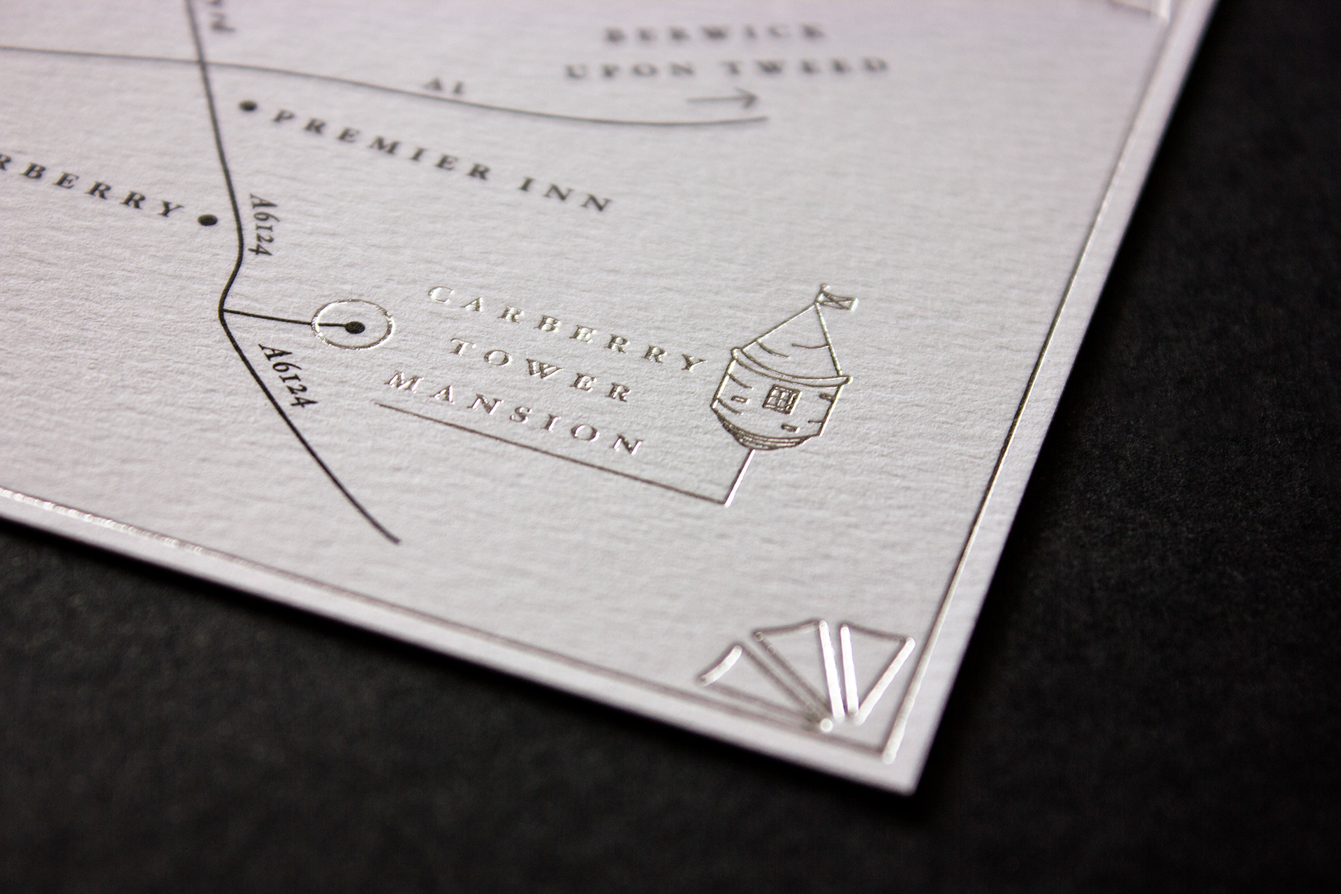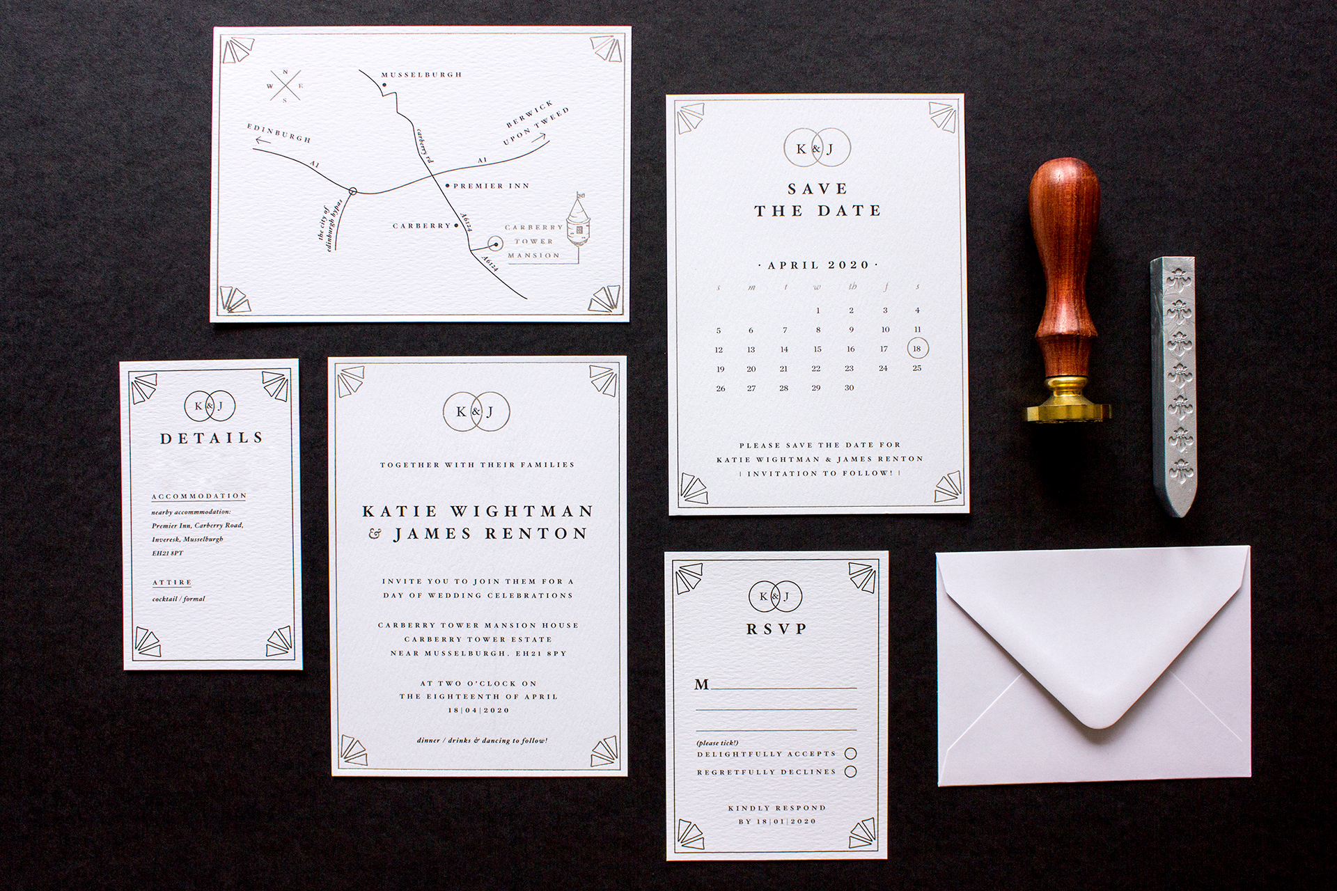 Bespoke wedding stationary created for Scottish couple Katie & Jamie. The logo lock-up was made up from their initials 'K&J' which are interlinked by two silver foiled wedding bands. Silver foil elements were used throughout all stationary highlighting details. The pack included a Ceremony invitation, Save The Date, Map, RSVP & details card. Each of which has a silver foiled border with designs from their wedding venue.