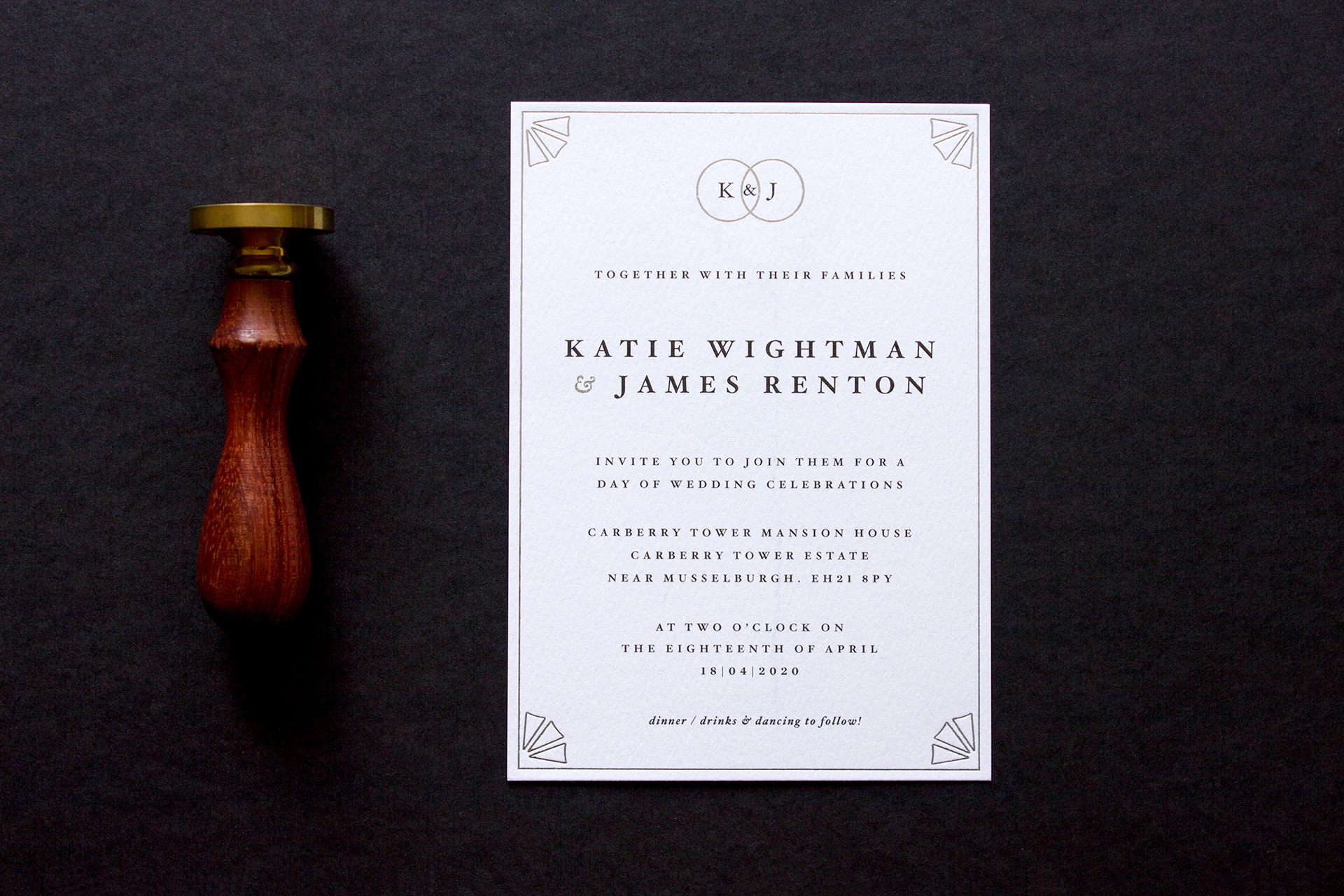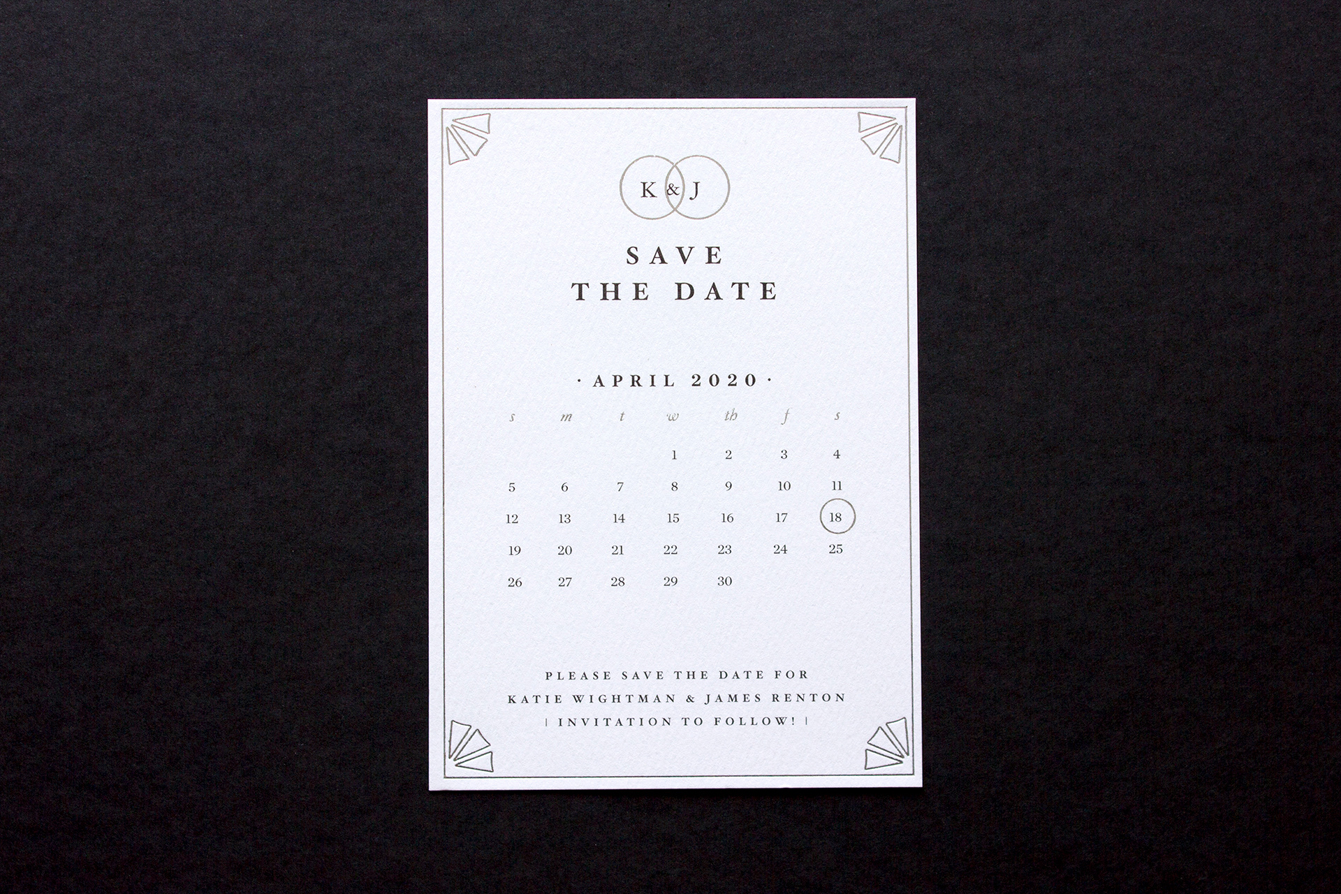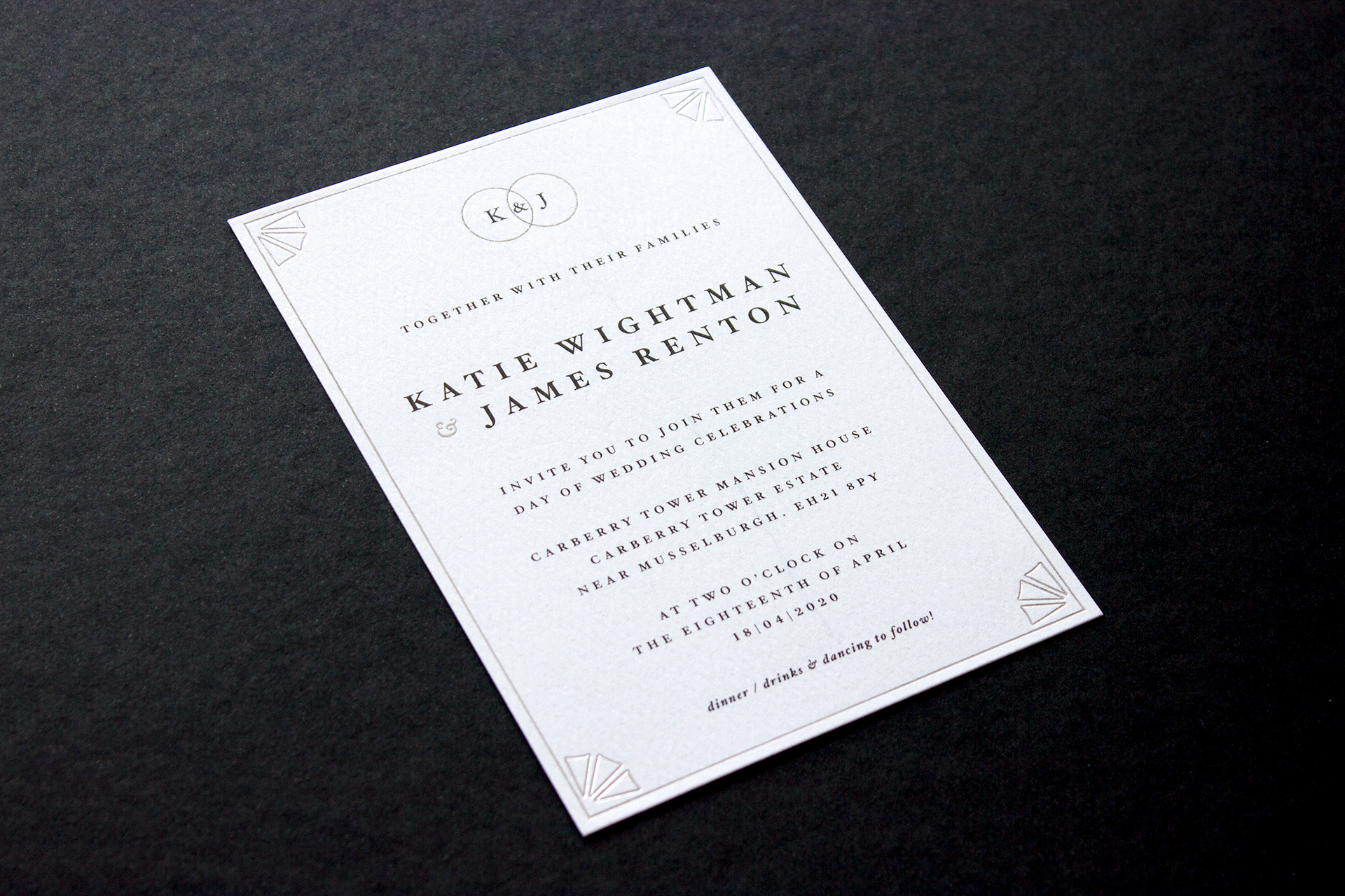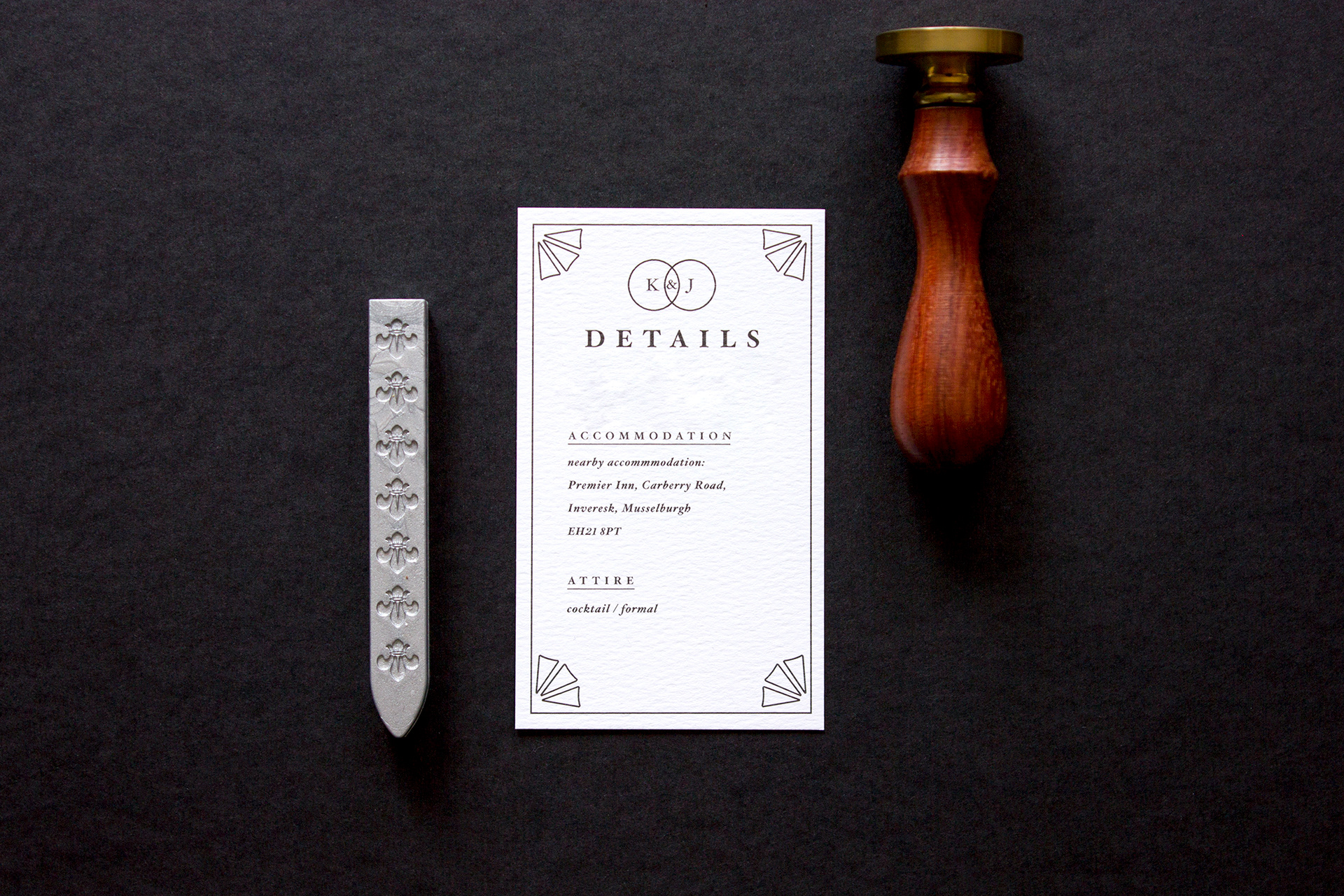 Bespoke wedding stationary created for Scottish couple Katie & Jamie. The logo lock-up was made up from their initials 'K&J' which are interlinked by two silver foiled wedding bands. Silver foil elements were used throughout all stationary highlighting details. The pack included a Ceremony invitation, Save The Date, Map, RSVP & details card. Each of which has a silver foiled border with designs from their wedding venue.