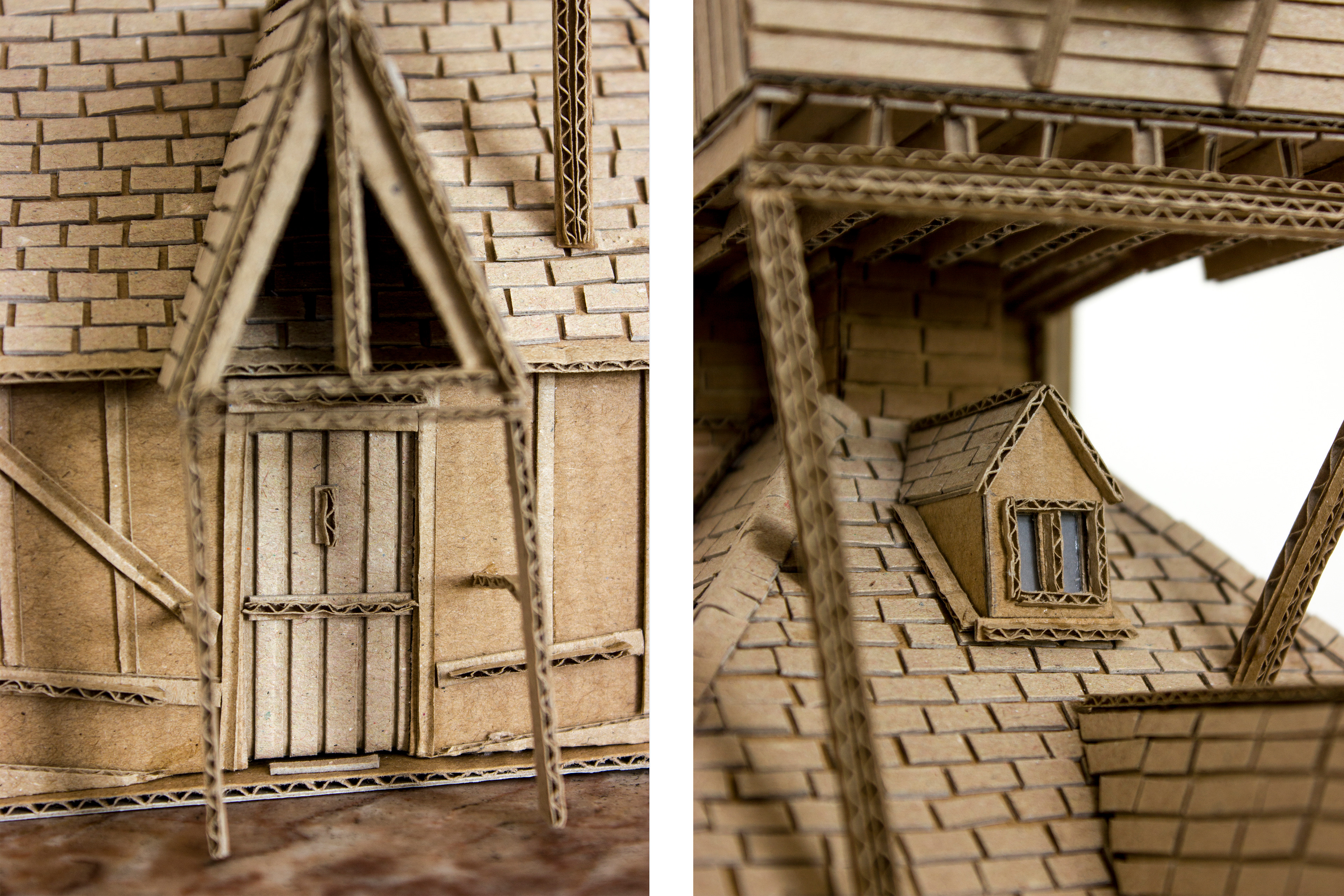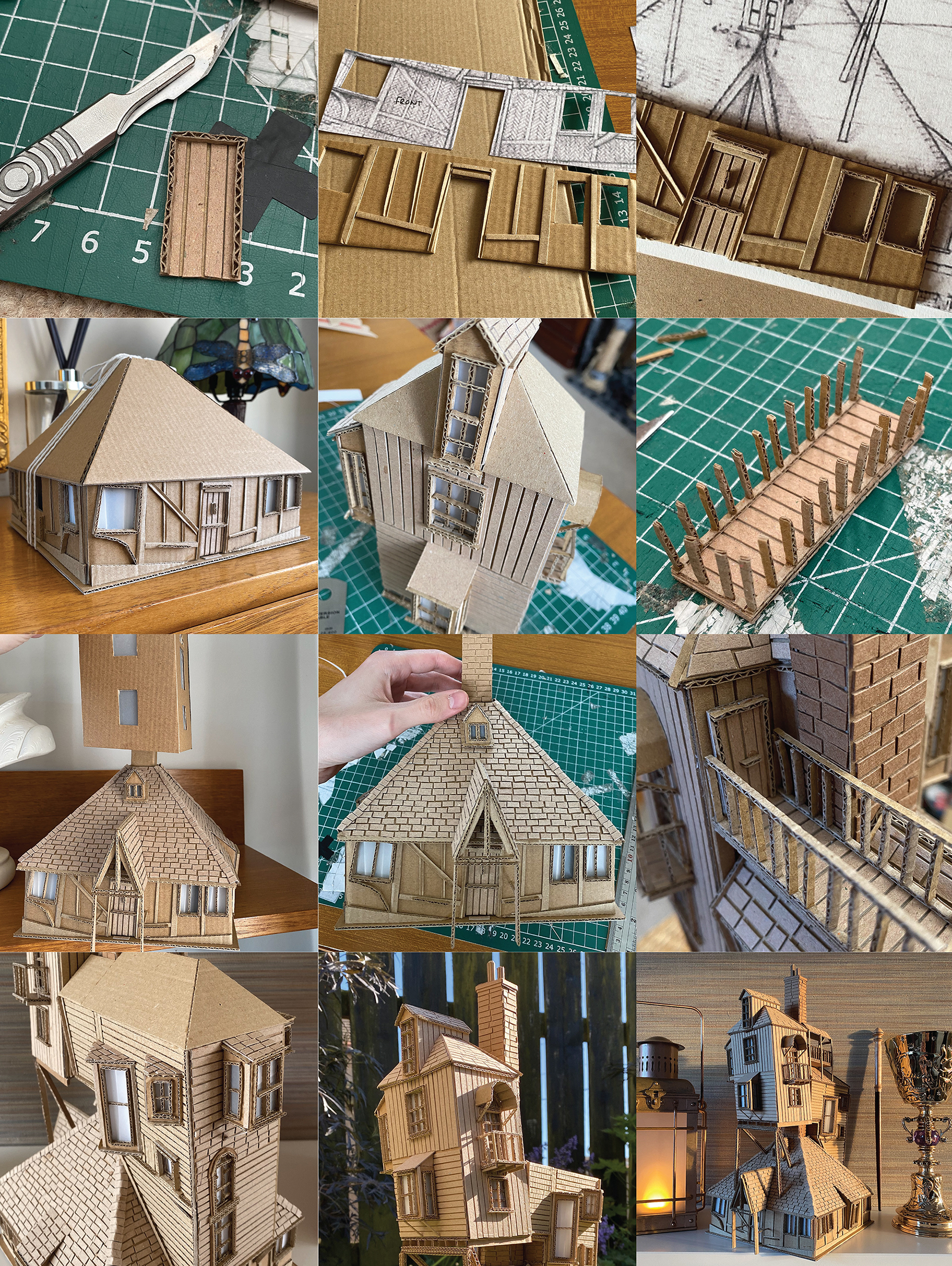 Sculpture made of the iconic Weasley's home from Harry Potter. During lockdown I wanted to create something to act as a memento to mark this time. So whilst staying at home I thought it was fitting to make the Weasley's home. The sculpture itself was made from recycled Amazon delivery boxes.